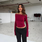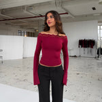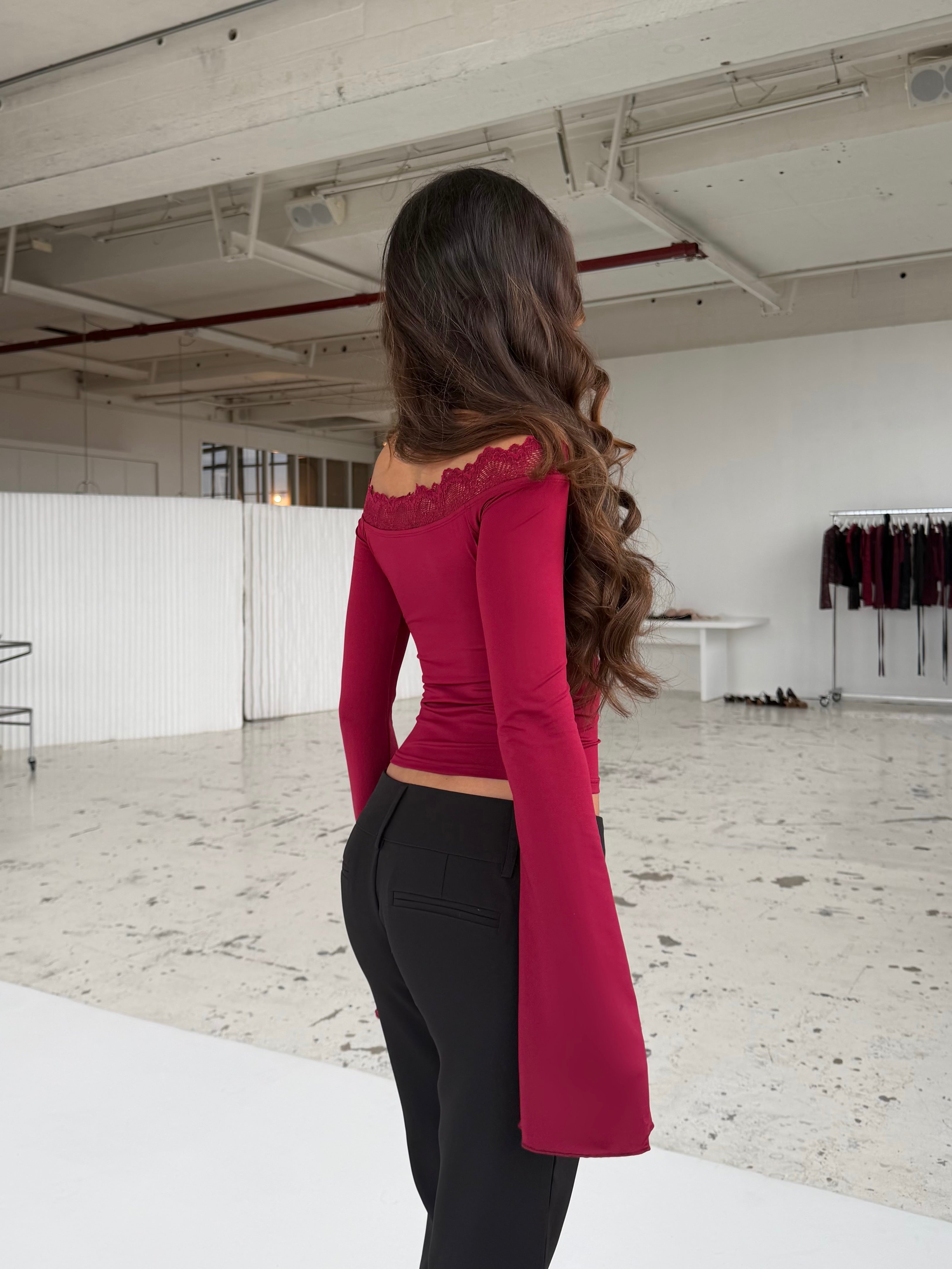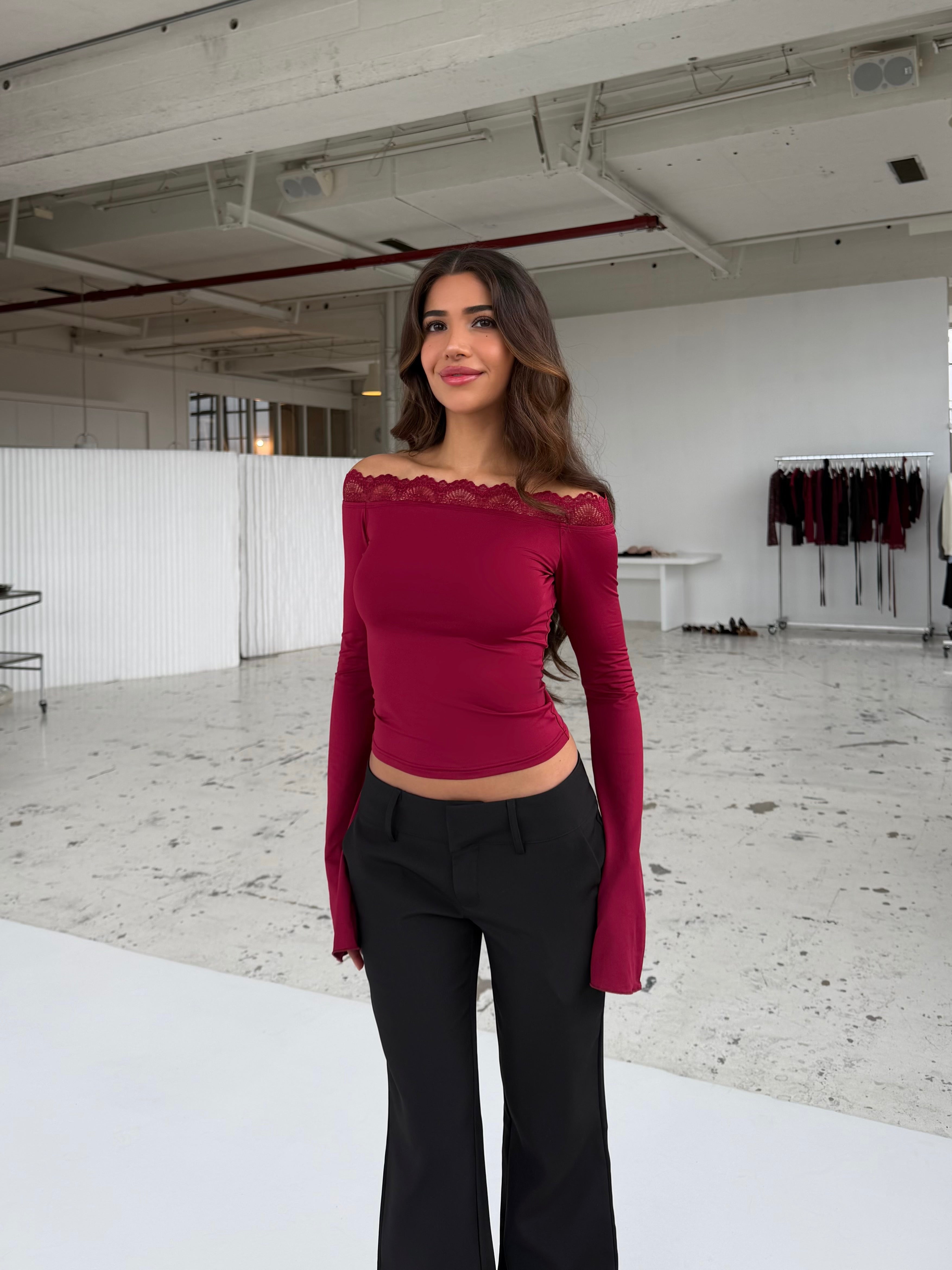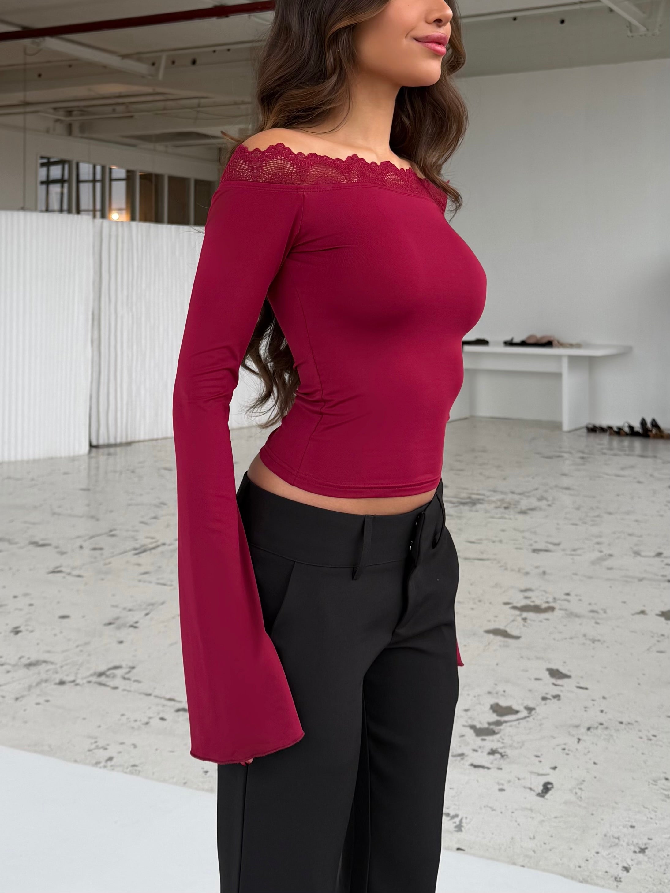 Beautiful off-shoulder lace top with long sleeves. The top is very stretchy.
