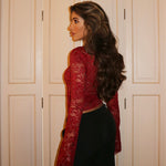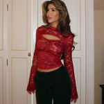 Beautiful lace top in material with a lot of stretch, that fits nicely to the body. The top has long sleeves and a cut out over the chest.