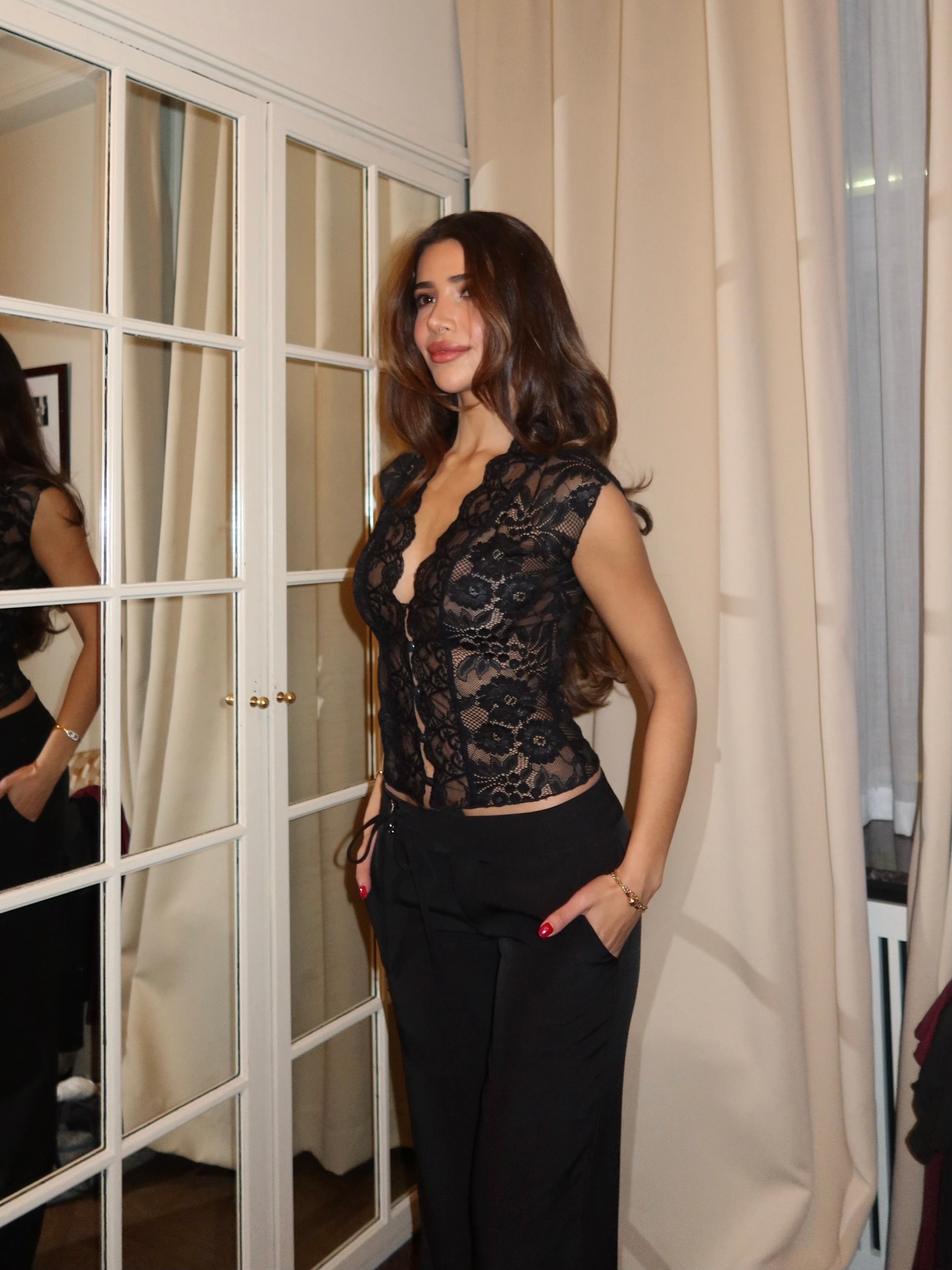 Beautiful lace top with buttons and short sleeves. The top is made from a soft lace fabric that is very comfortable to wear.