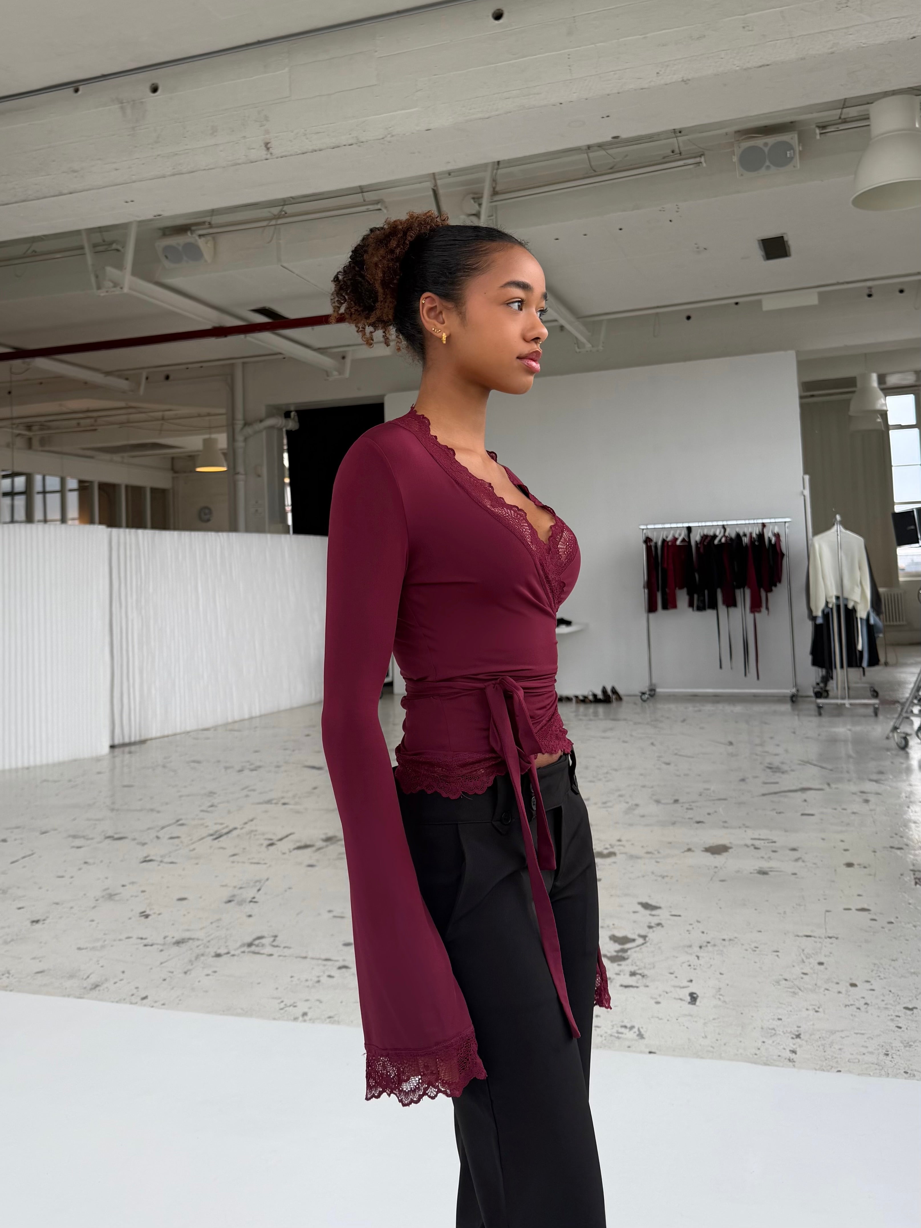 Wunderschönes Wickeltop aus dem weichsten, sehr dehnbaren Material, das sich schön an den Körper anschmiegt. Das Top hat lange Ärmel und einen tiefen Ausschnitt mit Spitze.