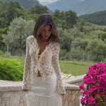 Schöne blonde Oberseite mit Krawatten und langen Ärmeln. Das Oberteil besteht aus einem weichen Spitzenstoff, der sehr bequem zu tragen ist. Die Oberseite ist an zwei Stellen gebunden und kann daher nach Wunsch festgezogen werden.