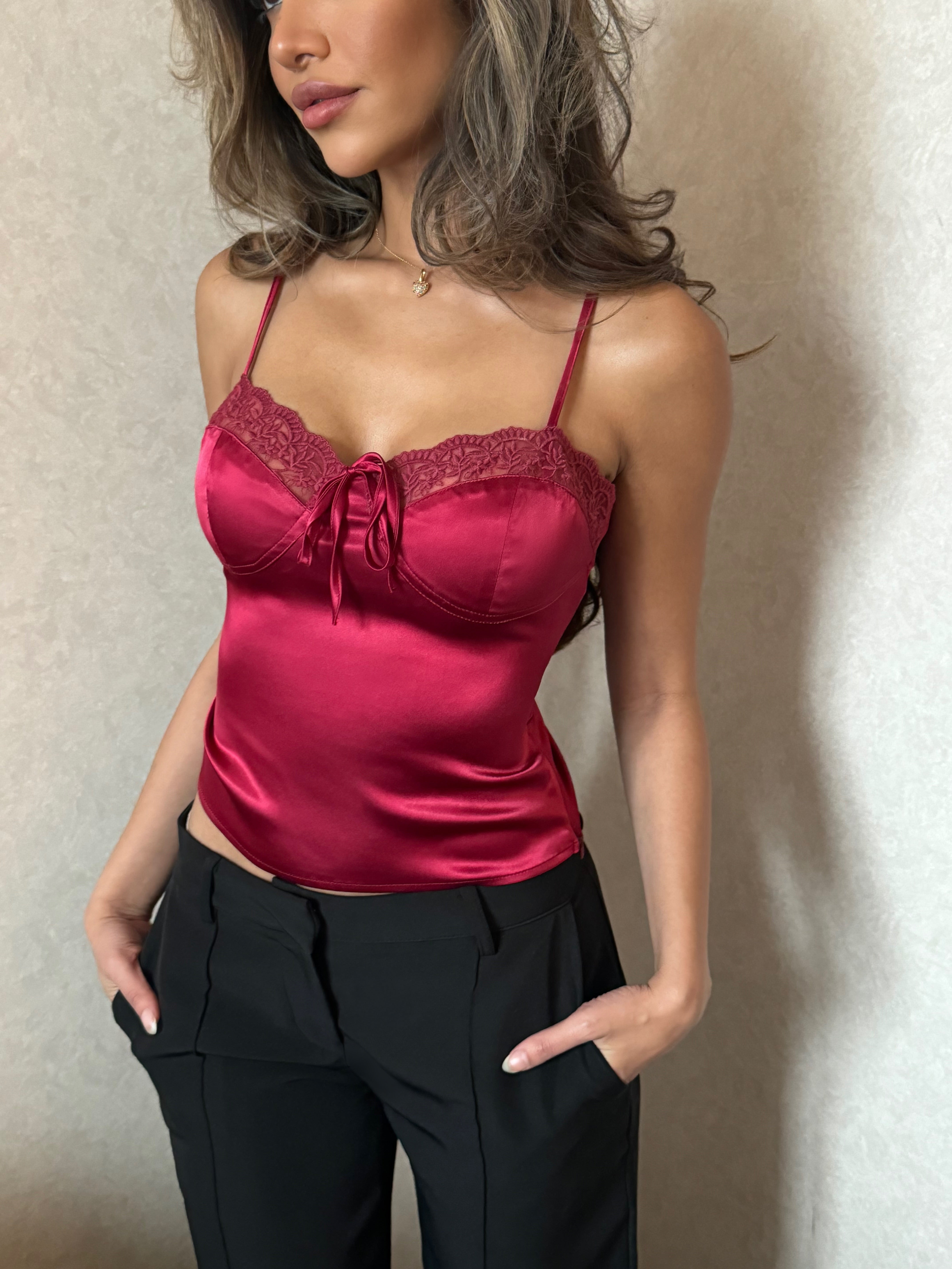 Satin -Oberteil mit Spitzenkante im weichsten Material. Das Oberteil hat Strecken und sitzt wunderschön zum Körper. Es gibt einen Reißverschluss in der Seite. Das Oberteil hat Krankheiten unter der Brust, um Corsage -Look zu verleihen, aber nicht mit einem Kleiderbügel.
